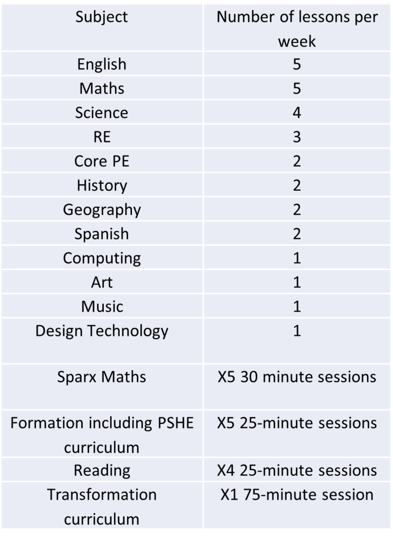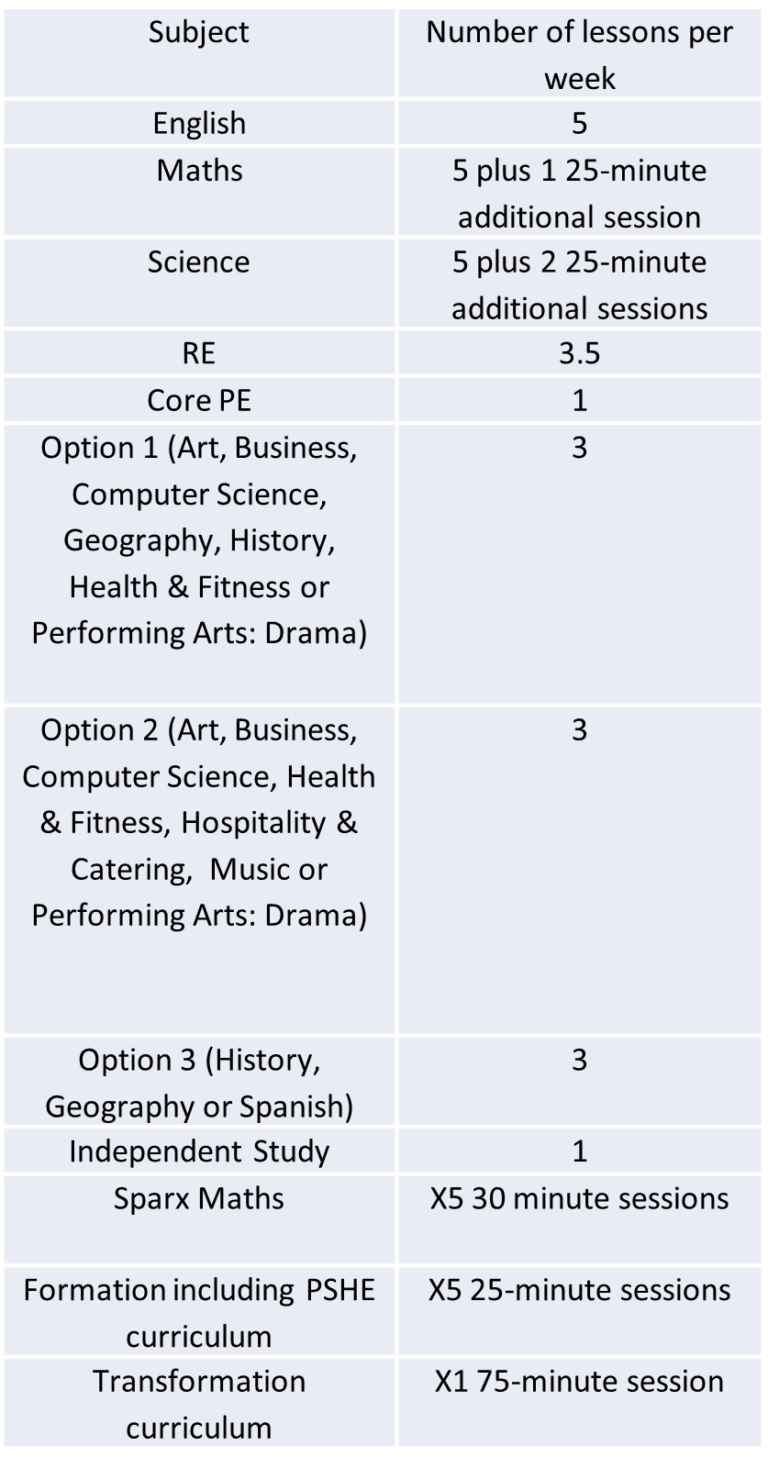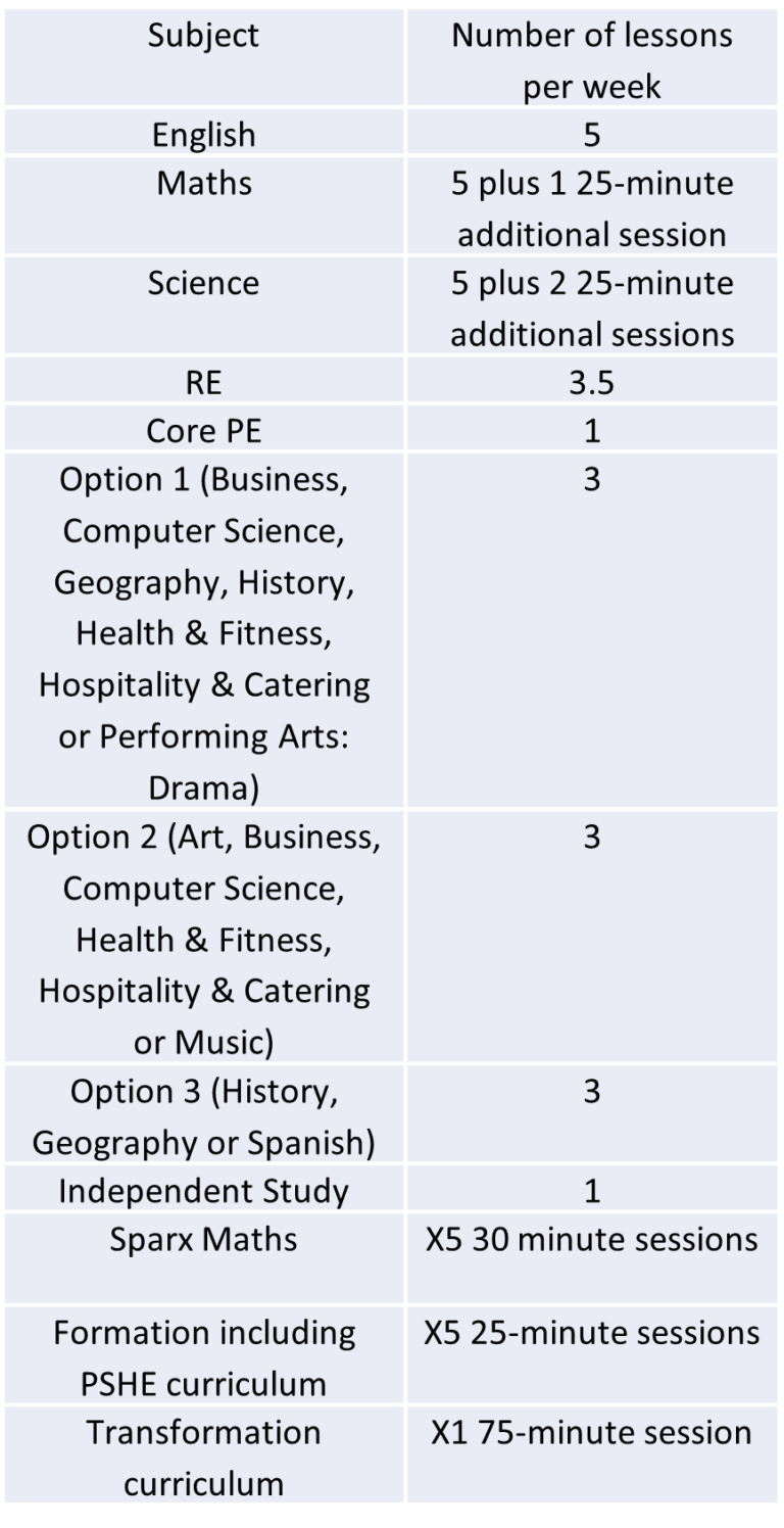 The school day consists of 6 lessons of 50 minutes plus a 20 minute Formation session and a 30 minute Sparx Maths session where students use the ‘Sparx’ online platform to revise their Maths skills.